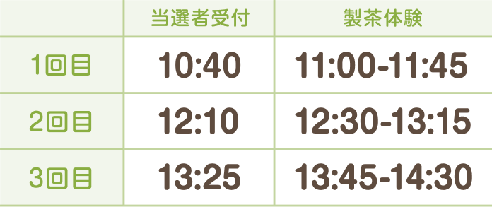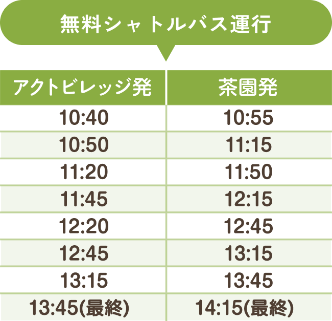 ※当日は藤河内茶園への車両進入はできません。茶園見学や茶摘み体験を希望される方はアクトビレッジ出発のシャトルバスをご利用ください。