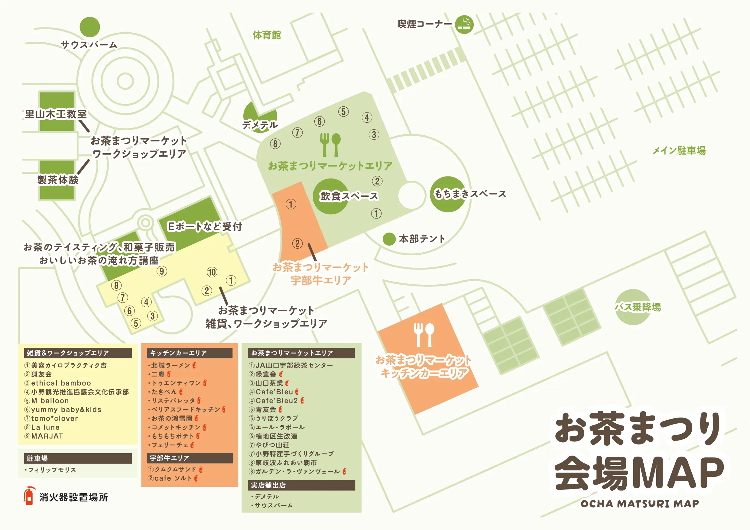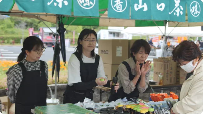 ⼭⼝茶の新茶販売、飲⾷ブースではお茶を使ったフードやスイーツ、また雑貨販売やワークショップも開催。
