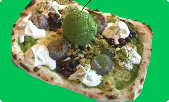 お茶を使ったピザ、ピザ、フライドポテト、唐揚げ、チュ ロス、かき氷、スムージー