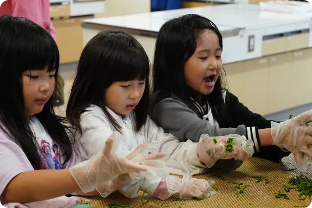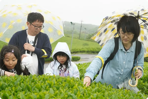 茶畑でお茶を摘み、採れた葉っぱをお茶にするまでの体験を行います。